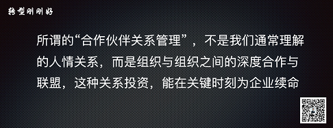 一是保链。以供应商为例,你的企业平时与供应商的关系怎么样?是纯粹的钱货交易关系,还是紧密协同的战略伙伴关系?你的企业是供应商眼中的VIP吗?你在供应商遇到危机的时候,是否出手相助过?如果这些都没有,不好意思,在非常时期,资源有限的情况下,供应商很难对你重点关注。甚至连“加钱”(增加成本)这种方式都无法解决问题。要明白,所谓的“合作伙伴关系管理”(包括供应商、协作厂商、销售平台等等),不是我们通常理解的人情关系,而是组织与组织之间的深度合作与联盟,这种关系投资,能在关键时刻为企业续命。有的企业说,平时就是没做好关系管理,现在怎么办?亡羊补牢,犹未迟也,至少要比竞争对手更早意识到这个问题,更快展开行动,拿出点诚意来,站在合作伙伴的角度多想想他们需要什么,力所能及的提供支持,才是首要行动。
