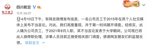 11日凌晨,@四川航空 在官方微博中发布通报。通报称,4月10日下午,有网友微博发布信息,一名公司员工于2015年在其个人社交媒体上发布不当言论。四川航空第一时间展开调查。