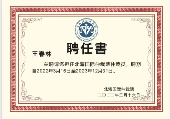 近日,王春林律师近日还被北海国际仲裁院聘为仲裁员。北海国际仲裁院设立于2003年,是专门为解决平等主体的公民、法人和其他组织之间发生的合同纠纷和其他财产权益纠纷提供公益性服务的非营利法人。北海仲裁主要受理银行信贷、互联网金融、投融资、民间借贷、证券保险、经济贸易、房地产、建设工程、知识产权等案件。