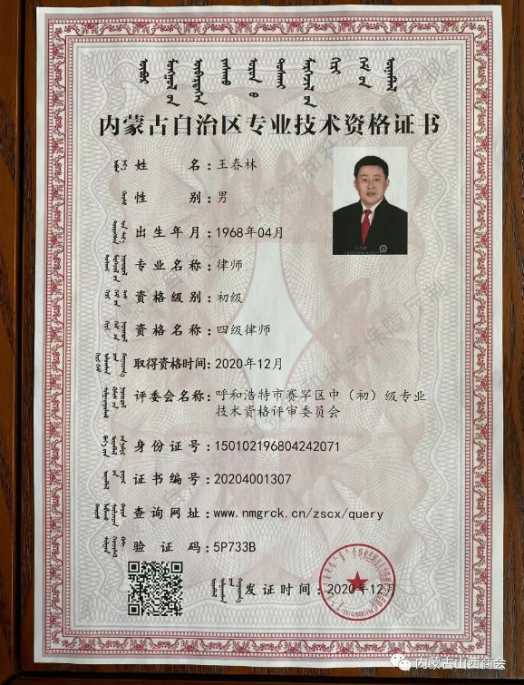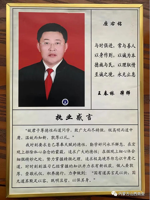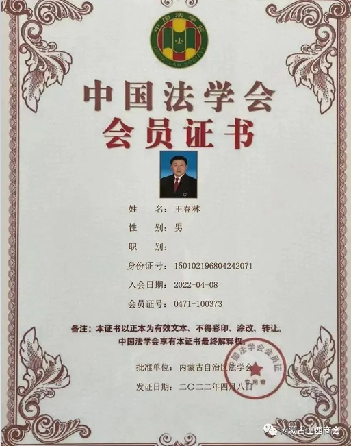 2022年4月8日,内蒙古自治区法学会批准商会法律顾问、内蒙古尊恒律师事务所主任律师王春林加入中国法学会并颁发《中国法学会会员证》。
