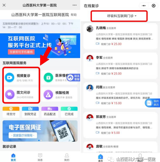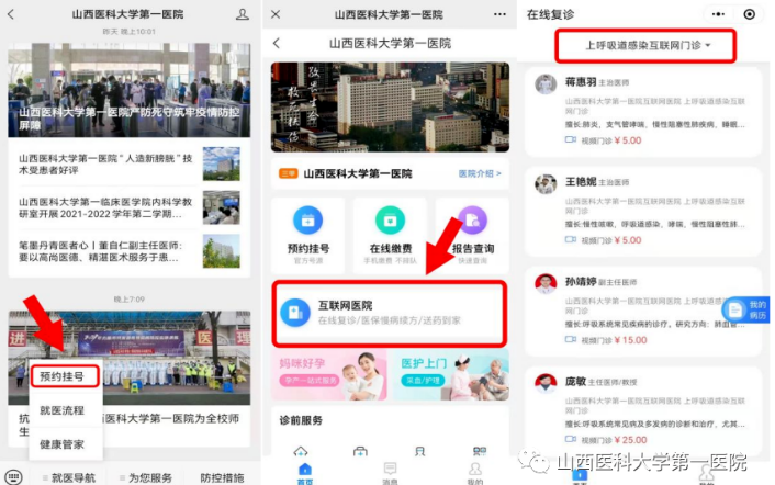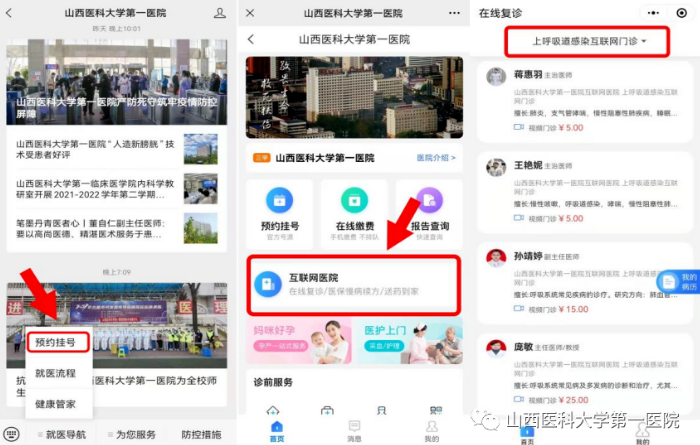 互联网医院线上门诊只针对部分常见病、病情稳定的慢病复诊患者,初次就诊患者无法在线问诊。使用方法如下:患者微信搜索“山西医科大学第一医院”公众号,点击左下角“就医导航”,选择“预约挂号”,进入下一界面后,点击“互联网医院”,选择“视频复诊”或“图文问诊”,选择“上呼吸道感染互联网门诊”或“呼吸科互联网”门诊,选择医生挂号即可。