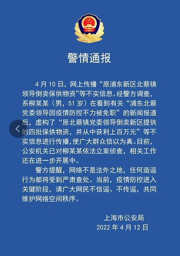 今日上海警方通报:4月10日,网上传播“原浦东新区北蔡镇领导倒卖保供物资”等不实信息。经警方调查,系柳某某(男,51岁)在看到有关“浦东北蔡党委领导因疫情防控不力被免职”的新闻报道后,虚构了“原北蔡镇党委领导倒卖新区提供的四批保供物资,并从中获利上百万元”等不实信息进行传播,使广大群众信以为真。目前,公安机关已对柳某某依法立案侦查,相关工作还在进一步开展中。
