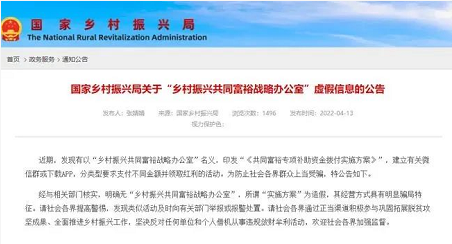 4月13日,国家乡村振兴局发布了关于“乡村振兴共同富裕战略办公室”为虚假信息的公告。
