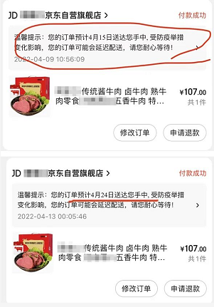 观察者网:我先前在京东防疫专供页面抢到一盒加工好的肉,原本写15号配送,后来改到17号,在采访你之前再看一眼,又变成24号。看网上不少上海居民也在反映这一情况。请问为何会有这些变动?