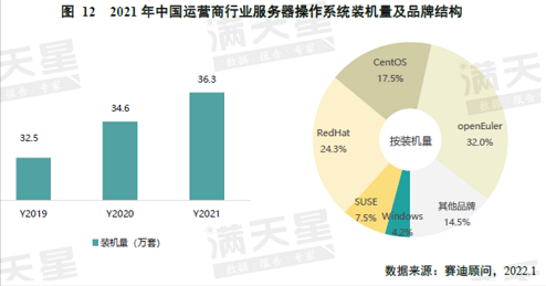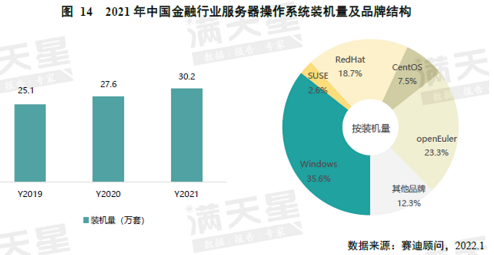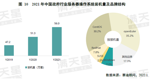 根据《中国服务器操作系统市场研究报告》,2021年,中国政府行业服务器操作系统装机总量为56万套,openEuler系产品市场占有率第一,达35.2%;openEuler系产品在运营商市场装机量达36.3万套,市场份额也排在第一,达32.0%;openEuler系产品在金融行业装机量达到30.2万套,份额达23.3%,排名第二。