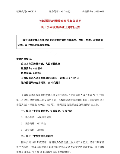 4月19日,*ST长动(000835.SZ,即长城国际动漫游戏股份有限公司,以下简称长城动漫)发布公告称,公司收到深交所终止公司股票上市的决定,公司股票将从4月27日起进入退市整理期,退市整理期届满的次一交易日,公司股票将被摘牌并终止上市。