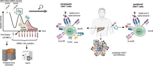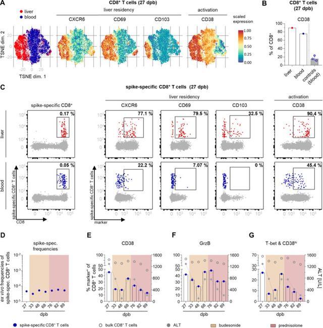 研究认为,从机制上讲,这名52岁的患者症状不同于典型的自发性免疫性肝炎,后者通常与外周免疫球蛋白升高、浆细胞为主的浸润和突出的界面性肝炎有关。在这一临床案例中,虽然外周免疫球蛋白和肝内B细胞和浆细胞的肝内富集略有升高,但在细胞毒性(CD8)T细胞的水平上观察到更显着的相关性。包括疫苗引发的新冠病毒S特异性反应活化的细胞毒性(CD8)T细胞在患者肝脏中高度富集,以至于它们成为了患者肝内最为富集的免疫细胞群。值得注意的是,这些新冠S特异性(CD8)T细胞的外周激活状态与肝炎严重程度和引入免疫抑制治疗后的临床病程相关。