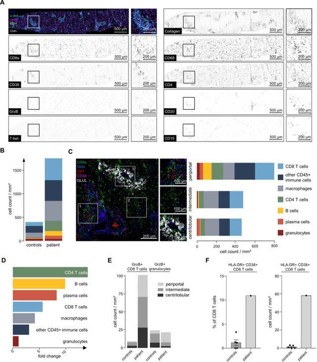 值得注意的是,患者肝组织中的T淋巴细胞簇(CD8)是其免疫细胞中最丰富的,这与典型的自身免疫性肝炎有所不同。同时,这名患者的B细胞和浆细胞相对较低,而典型的自身免疫性肝炎则B细胞和浆细胞则更丰富。对不同免疫细胞亚群的肝实质的空间分析,研究者发现患者的门静脉周围区域存在更广泛的免疫细胞浸润。虽然患者的B细胞和浆细胞主要在港脏门静脉周围区域富集,但(CD8)T淋巴细胞呈全小叶分布。值得注意的是,患者的细胞毒性(CD8)T细胞高度积累,而其他表达颗粒酶B的细胞的水平则保持不变。