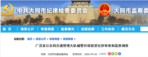广灵县公安局交通管理大队辅警许靖涉嫌严重违纪违法,经大同市纪委监委指定,目前正接受浑源县纪委监委纪律审查和监察调查。