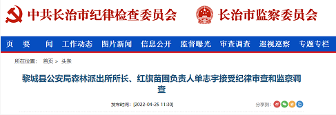 黎城县公安局森林派出所所长、红旗苗圃负责人单志宇,涉嫌严重违纪违法,经长治市纪委监委指定,目前正接受长治市上党区纪委监委纪律审查和监察调查。