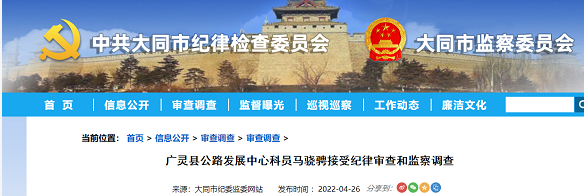 广灵县公路发展中心科员马骁骋涉嫌严重违纪违法,经大同市纪委监委指定,目前正接受浑源县纪委监委纪律审查和监察调查。