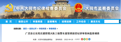 广灵县公安局交通管理大队三级警长董智勇涉嫌严重违纪违法,经大同市纪委监委指定,目前正接受浑源县纪委监委纪律审查和监察调查。