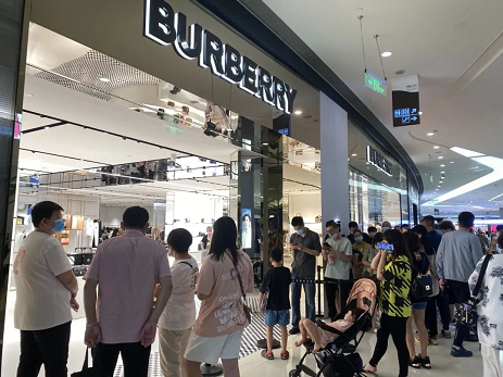 在巴宝莉(Burberry)、古驰(Gucci)等精品店外,顾客排起长队,付款往往要等20分钟至30分钟。免税城一楼的休息座位也是“一座难求”,许多消费者逛累了,只能坐在地上。