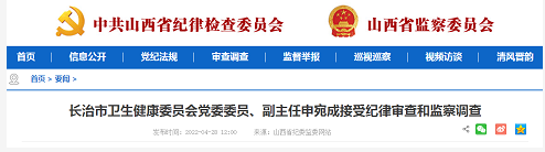 长治市卫生健康委员会党委委员、副主任申宛成涉嫌严重违纪违法,主动投案,目前正接受长治市纪委监委纪律审查和监察调查。