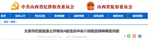 近日,太原市纪委监委公开曝光4起违反中央八项规定精神典型问题。具体如下。