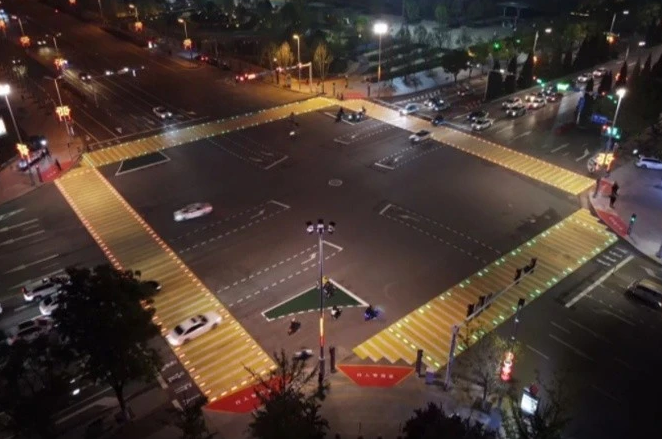 由400余块会发光的地砖组成的“智慧斑马线”与人行横道信号灯同步,它会随着人行横道信号灯颜色的变化而变化。当路口的人行横道信号灯变为绿色时,“智慧斑马线”灯带也变为绿色;当路口的人行横道信号灯变为红色时,灯带也变为红色。进一步增强了行人和驾驶人视觉感受提高了夜间斑马线视觉效果。