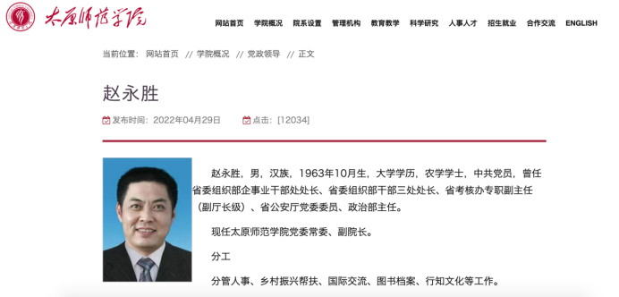 澎湃新闻记者5月5日查询发现,太原师范学院官网“党政领导”栏目更新信息显示,原任山西省公安厅党委委员、政治部主任的赵永胜已经调任太原师范学院党委常委、副院长。截屏图