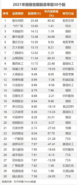 而以2021年年报的每股税前派现额为派现基准,以最新收盘价为基准股价,有141只个股的报告期股息率超过5%,其中9股超过10%。