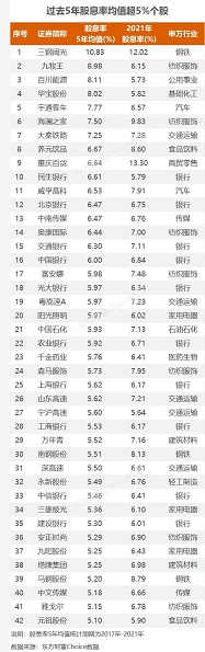 此外,在最新报告期股息率超5%的141只个股中,还有部分个股持续多年高股息。统计显示,141只个股中有42只个股2017年至2021年的5年股息率均值超过5%。