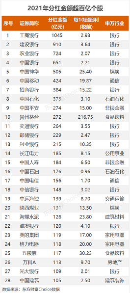从个股来看,有28家上市公司2021年度拟现金分红金额超过百亿元。“四大行”依然是分红大户,居首的工商银行2021年拟现金分红高达1045亿元,建设银行拟现金分红910亿元,农业银行为724亿元,中国银行为651亿元。此外,中国神华、中国平安、贵州茅台、中远海控、美的集团、格力电器、五粮液等也位列其中。