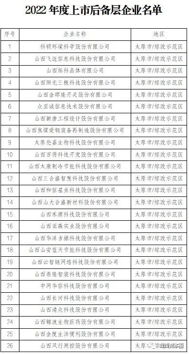 另外,早在2022年3月,山西省金融办先期公布了2022年度“省重点上市后备企业”名单,共涉及35家企业。