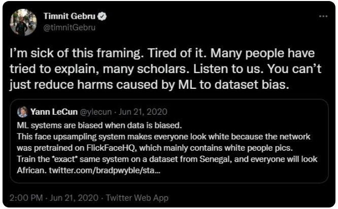 这一表示遭到了包括 Gebru 在内很多人的批评。Gebru 表示对 LeCun 的发言很失望,因为 AI 算法中的偏见不只是来自数据。她本人在此方面做了很多研究,发表了一些论文。她的观点一直是:AI 的偏见不止来自于数据集,光解决数据集并不能彻底解决 AI 偏见问题。