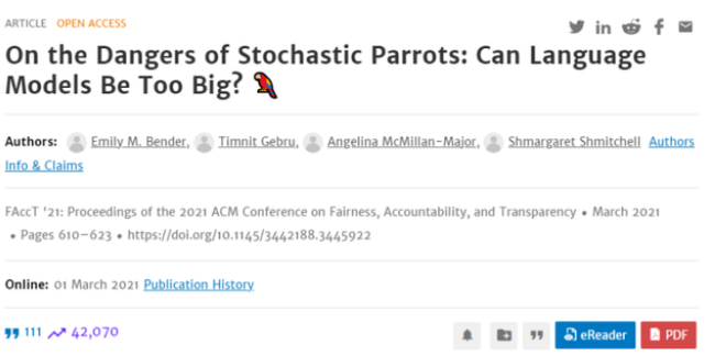 也是在2020年,Gebru 的团队撰写了一篇论文 On the Dangers of Stochastic Parrots: Can Language Models Be Too Big? 希望揭露超大规模语言模型在实际使用中的危险性,批评其可能在 AI 偏见方面造成的影响。