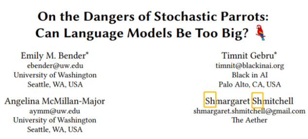 值得一提的是:虽然 Gebru 在论文发表前就已经和谷歌掰了,另一位作者 Margaret Mitchell 在文章发表的时候仍然供职于谷歌(后来也还是被开除了)。
