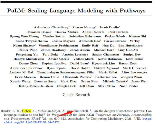 在模型架构解释 (Model Architecture) 和道德思考 (Ethical Considerations) 部分,PaLM 论文曾经先后至少两次引用了前年被谷歌拒绝发表的那篇 Gebru 团队的论文。