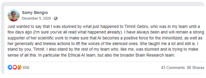 Gebru 在谷歌的汇报对象 Samy Bengio 在当时表示自己感到非常震惊。Bengio 曾获得谷歌杰出科学家的殊荣,是公司14年元老,原谷歌大脑团队的创始成员之一(也是 AI 三教父之一 Yoshua Bengio 的胞弟),后来也直接因为对解雇 Gebru 不满,在2021年离开了谷歌。