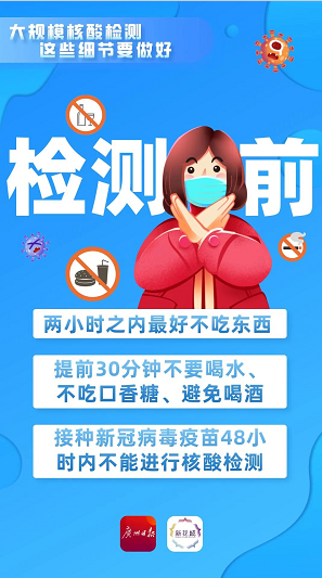 为提高咽拭子核酸检测的准确度,建议检测前30分钟受检者不要喝水、饮酒或嚼口香糖,以保证咽拭子核酸检测具有较高的准确性。
