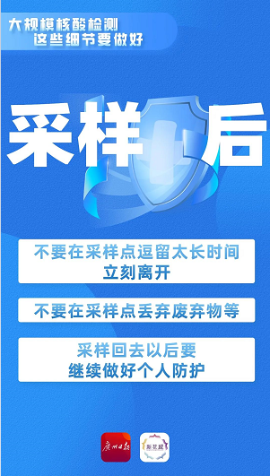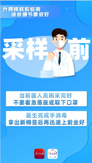 当前一位检测者检测完毕,不要立刻上前,可以等医护人员做好下一个采集工具的准备工作后,再上前摘口罩,配合指令尽快完成检测,然后快速戴上口罩,迅速离开采样点。
