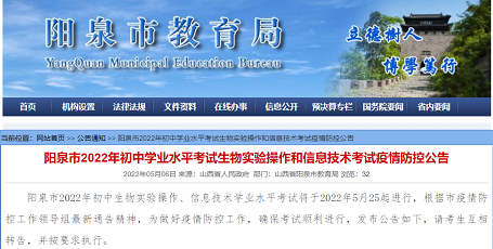 阳泉市2022年初中生物实验操作、信息技术学业水平考试将于2022年5月25起进行,根据市疫情防控工作领导组最新通告精神,为做好疫情防控工作,确保考试顺利进行,发布公告如下,请考生互相转告,并按要求执行。