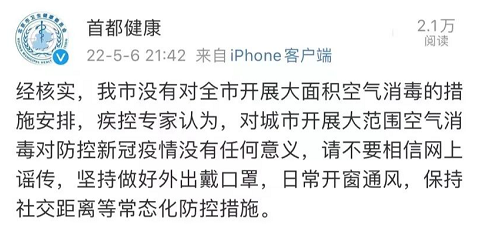 @首都健康 6日晚间发布消息:经核实,北京市没有对全市开展大面积空气消毒的措施安排,疾控专家认为,对城市开展大范围空气消毒对防控新冠疫情没有任何意义,请不要相信网上谣传。