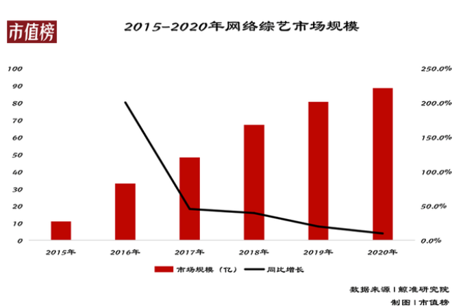 鲸准研究院的一份数据显示,从2017年到2019年,我国网络综艺市场规模始终维持着高于20%的增速,而网综90%以上的收入来自于广告招商。