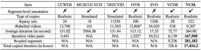 表 1. VCSL 与其他学术界现有数据集的比较