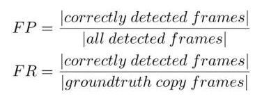 准确率和召回率的分子均为正确被检测到的片段,其中正确检测到的片段定义为只要与实际的侵权片段有一帧的重合即定义为正确检测。准确率的分母为所有被检测到的片段数量,召回率的分母为实际打标真实拷贝的片段数量。另外,VCDB 论文中还定义了帧的准确率和召回率: