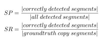 学术界范围内,之前在 Muscle-VCD[5]和 VCDB[4]中提出过片段级别拷贝检测的评价指标,这几年比较常见的学术界工作主要用了 VCDB[4]中定义的片段的准确率和召回率:
