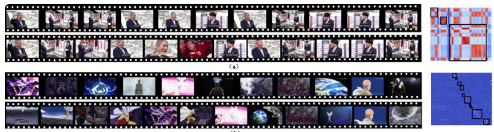 图 2. 视频侵权案例,(a),(b)图左侧为按时间排布的视频画面帧,右侧为视频帧序列相似图,横轴和纵轴分别代表着两个视频的时间轴,黑框内表示实际标注的侵权事件片段,详细解释图也可见于后文图 6 右侧。