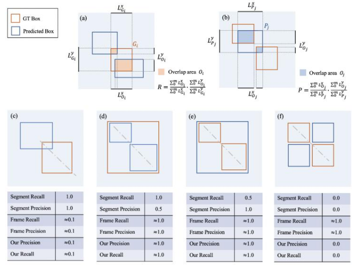类似的,首先该研究找到每个预测框与所有 GT 框的交际区域,如上图 (b) 所示,接下来计算这个交叠区域在 x 轴和 y 轴上的并集长度。同时计算出每个预测框的长度和宽度,最后分子为交叠区域的并集长度相加,分母为预测框的长度相加,即可得到 precision,如上图 (b) 所示。值得注意的是,该研究并没有用学术界常用的面积,而是采用了 x y 轴的投影进行计算,这是为了评价指标对片段切分更加鲁棒。最后,将 recall 和 precision 结合,得到 F-score,作为评价参数。