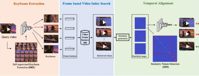 图 5. SSAN 算法结构,包括了关键帧抽取模块,基于帧的视频检索和时域侵权定位模块