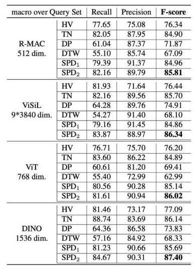 基于 VCSL 数据集和新的评价指标,该研究首先复现了目前常见的侵权定位算法,包括霍夫投票(Hough Voting)、时域网络(Temporal Network)、动态规划(Dynamic Programming)、动态时间扭曲(Dynamic Time Warping),并结合常见的开源帧特征算法,得到如下图所示的 benchmark。