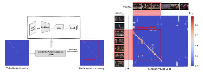 在相似图侵权定位检测(SPD)这个模块中,该研究巧妙地将侵权定位问题转变成一个目标检测问题,如下图所示,这样就只需要极少的运算量就可以得到侵权定位的结果,并且具有多段侵权检测能力。