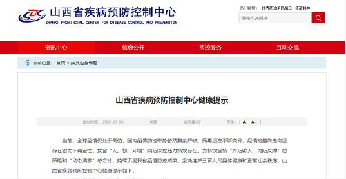 当前,全球疫情仍处于高位,国内疫情防控形势依然复杂严峻,病毒还在不断变异,疫情的最终走向还存在很大不确定性,山西省“人、物、环境”同防同控压力持续存在。为持续坚持“外防输入、内防反弹”总策略和“动态清零”总方针,持续巩固山西省疫情防控成果,坚决维护三晋人民身体健康和正常社会秩序,山西省疾病预防控制中心健康提示如下。