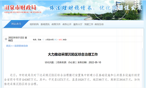 近日,市财政局及时下达采煤沉陷区综合治理搬迁安置集中新建小区基础设施和公共服务设施补助资金省级专项资金6307万元,其中:平定县1373万元、盂县1028万元、城区90万元、高新区3816万元,加快推进采煤沉陷区综合治理。