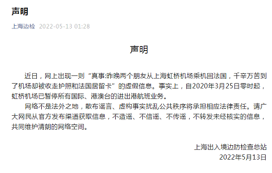 近日,网上出现一则“真事:昨晚两个朋友从上海虹桥机场乘机回法国,千辛万苦到了机场却被收走护照和法国居留卡”的虚假信息。上海出入境边防检查总站13日发布声明,事实上,自2020年3月25日零时起,虹桥机场已暂停所有国际、港澳台的进出港航班业务。