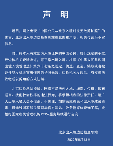 针对近日网上出现的“中国公民从北京入境时被无故剪护照”的传言,北京出入境边防检查总站5月13日发表声明称,相关传言为不实信息。