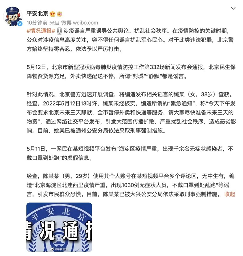 据 @平安北京消息,在疫情防控的关键时期,公众对涉疫信息高度关注,容不得任何谣言扰乱军心民心。对于此类违法犯罪,北京警方始终坚持零容忍,依法予以严厉打击。