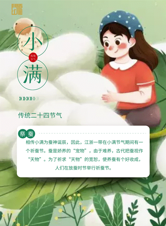 小满节相传为蚕神诞辰,所以在这一天,我国以养蚕称著的江浙一带也很热闹。小满节时值初夏,蚕茧结成,正待采摘缫丝,栽桑养蚕是江南农村的传统副业,家蚕全身是宝,及乡民的家食之源,人们对它充满期待的感激之情。于是这个节日便充满着浓郁的丝绸民俗风情。