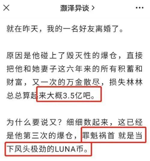 据传闻显示王珂炒LUNA币碰上毁灭性爆仓,直接将他和刘涛六年来的所有财富和积蓄散尽,总共损失约3.5亿元,爆仓的罪魁祸首是当下风头极劲的LUNA币。刘涛不堪重负决定与其离婚。
